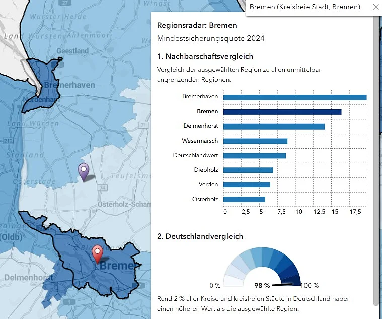 Deutschlandweit zeigt sich, dass die Mindestsicherungsquote in städtischen Regionen häufig höher ist als in den umgebenden, eher ländlichen Regionen, aber nur wenige Städte haben höhere Quoten als Bremen und Bremerhaven. Im Vergleich der kreisfreien Städte und Landkreise hat nur Gelsenkirchen mit 21,7 Prozent einen höheren Wert als Bremerhaven.